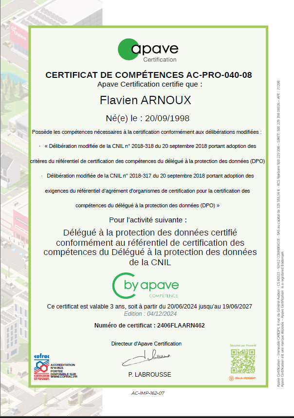 Reconnu pour mon expertise, je suis certifié APAVE – AC-PRO-040-08, une référence dans le domaine du conseil et de l’audit en protection des données.